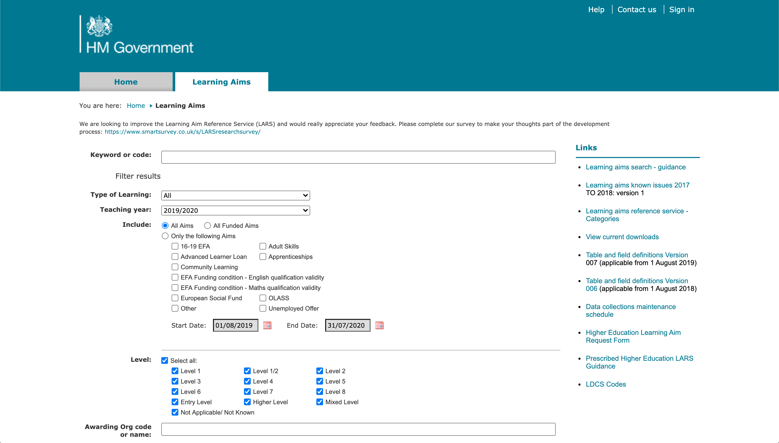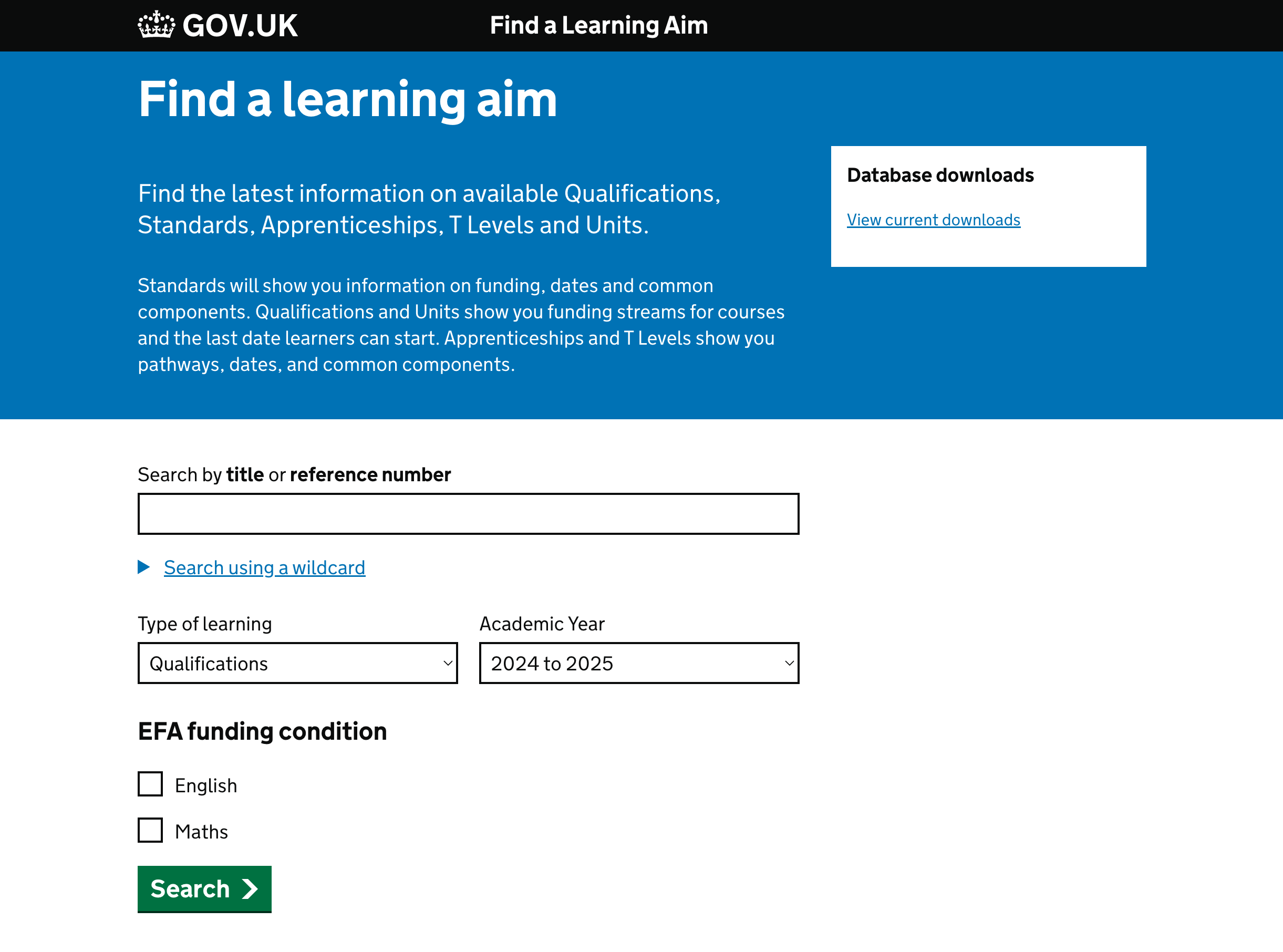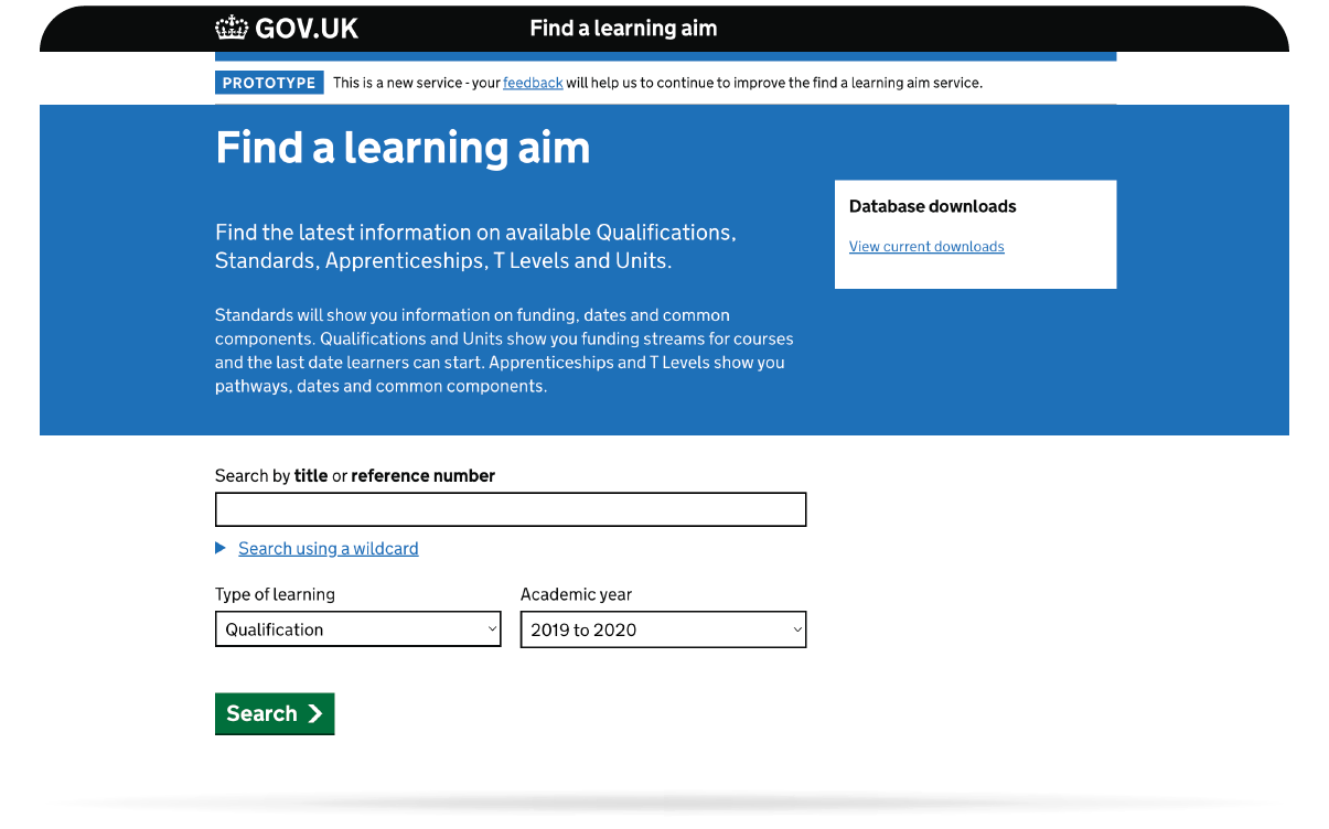 The "Find a learning aim" is an information service to find the latest information on available qualifications, standards, apprenticeships, T Levels and Units.